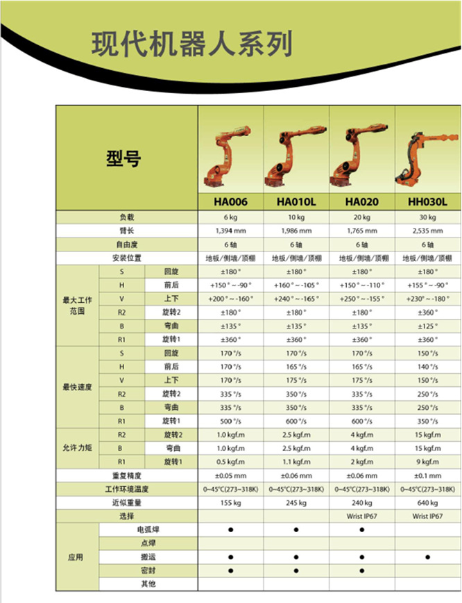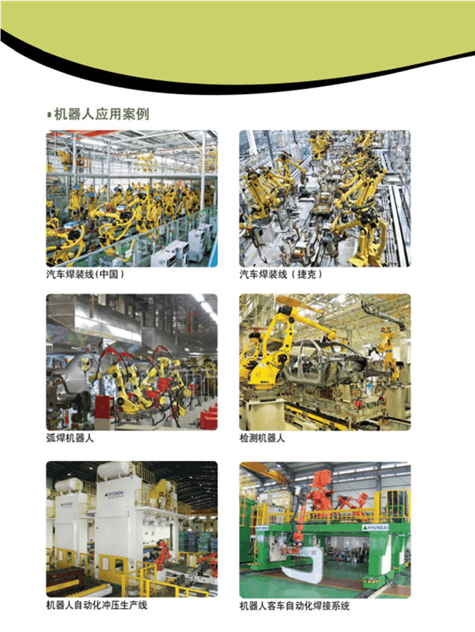 直角坐標(biāo)型工業(yè)機(jī)器人 、 圓柱坐標(biāo)型工業(yè)機(jī)器人、 圓柱坐標(biāo)型工業(yè)機(jī)器人 、多關(guān)節(jié)型工業(yè)機(jī)器人、平面關(guān)節(jié)型工業(yè)機(jī)器人?;『笝C(jī)器人、 激光焊機(jī)器人、電阻焊機(jī)器人、自動化焊接機(jī)器人、點焊機(jī)器人、等離子切割機(jī)器人、清潔機(jī)器人、上料機(jī)器人、物料輸送機(jī)器人、材料去除機(jī)器人、包裝機(jī)器人、噴漆機(jī)器人、自動鉆孔機(jī)器人、堆跺機(jī)器人、涂層機(jī)器人、去毛刺機(jī)器人、磨銷機(jī)器人、高溫噴涂機(jī)器人等。